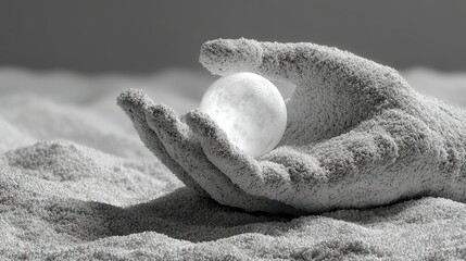 A monochromatic image of a person's hand grasping an apple amidst sand, against a leaden sky