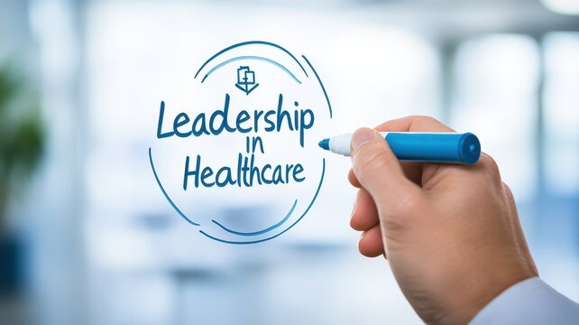 Leadership development in healthcare management concepts. Hand writing "Leadership in Healthcare" on a transparent board.