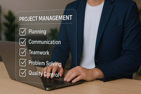 Project management, planning, communication, teamwork, problem solving, and quality control are essential skills for business success, shown by professional working on laptop