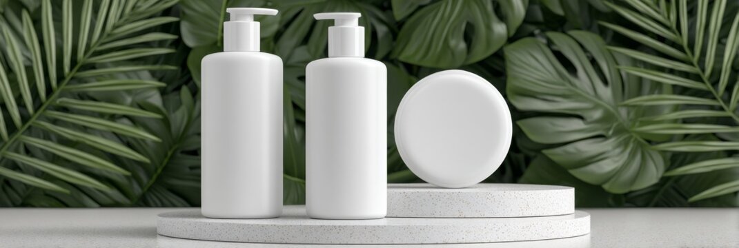 A minimalist white stone podium featuring natural leaf accents fosters a serene ambiance for displaying spa and wellness products in a soothing environment