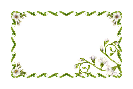 Watercolor floral frame with wavy green leaves, white flowers. Botanical watercolor horizontal template. Perfect for wedding invites, botanical prints, eco branding or spring-themed stationery