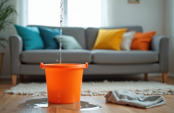 Water drips from ceiling into orange plastic bucket on wooden floor. Leaking roof causes water damage and household problem. Wet cloth lies nearby. Focus on indoor leak disaster.