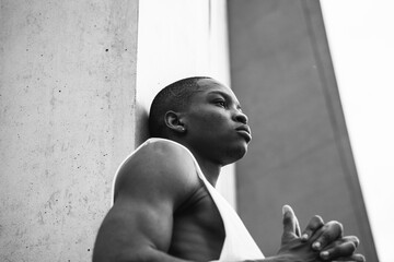 Thoughtful young man leaning on wall