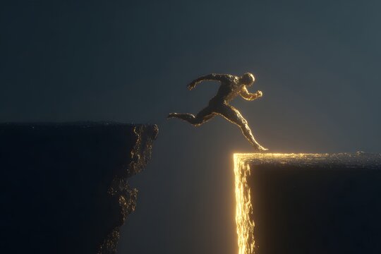 Courage man jumping over cliff on sunset background,Business concept idea