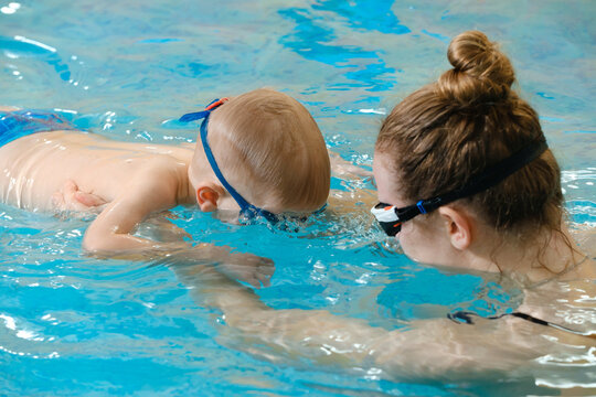 Cute blonde toddler is diving under the water in the swimming pool and swimming there until his mother helps him to get out. An underwater shot