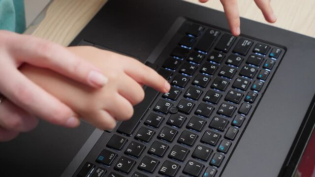 Top view of mother showing her child how to use computer keyoard. Boy with parent learnign and studying on laptop computer