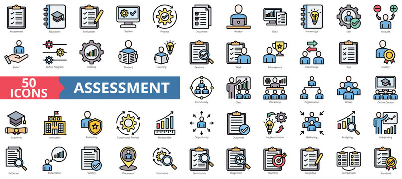 Assessment icon collection set. Containing education, evaluation, system, process, document, worker, data icon. Simple flat outline vector illustration
