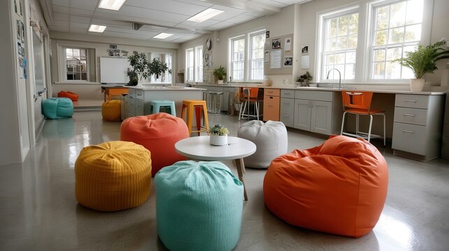 A modern classroom filled with vibrant bean bags creates a welcoming and relaxed learning environment for students, encouraging creativity and collaboration among peers.