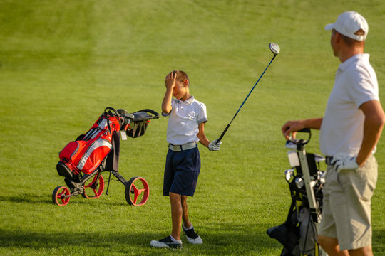 The boy practice golf hits at golf course