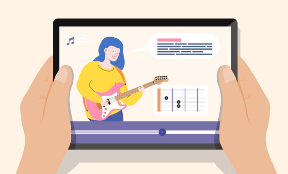 Online guitar lessons concept illustration. Music course concept, distance learning from home. Online study, education. Cartoon people vector illustration. Vector 10 eps