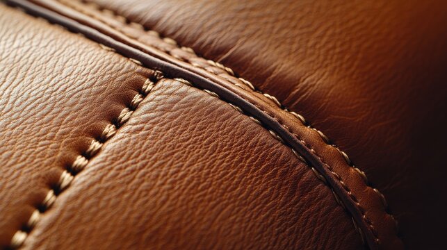 A detailed close-up view of a leather seat featuring intricate stitching patterns. The leather is smooth and well-preserved, showcasing the craftsmanship of the stitching work.