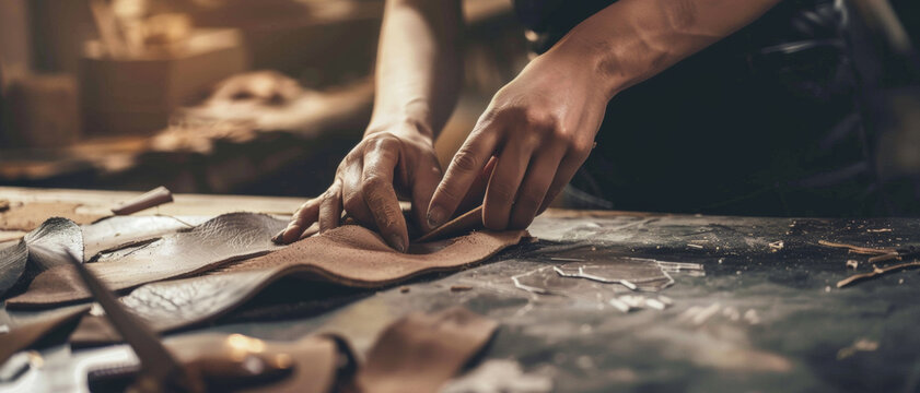 Artisan's hands meticulously crafting leatherwork with passion and precision.