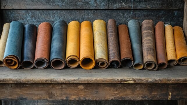 Colorful leather rolls neatly arranged on an antique wooden workbench showcasing craftsmanship and leatherworking materials for artisans.