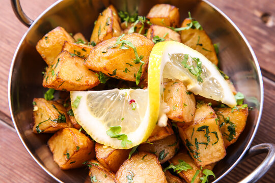 Batata Harra or lebanese spicy potatoes with lemon served in dish isolated on background top view of hot mezza