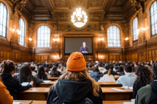 A university lecture hall with students taking notes while a professor explains on a large screen