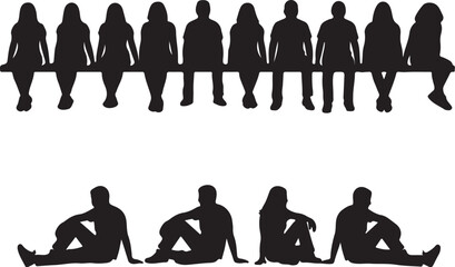 Silhouette group of people sitting on a ledge and sitting cross-legged on white background Keywords: silhouette, group, people, sitting, cross-legged, white background, men, on transparent background