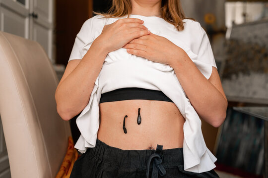 Medical leech on the human body drink blood. Treatment with leeches. Macro video.