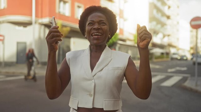 Woman holding smartphone in right hand, left fist raised while smiling and looking upward on a busy urban street; joy confidence.