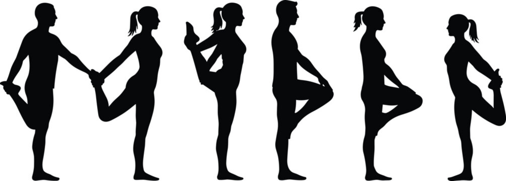 Standing quadriceps stretch, fitness silhouette illustration, male and female workout pose, leg balance exercise, physiotherapy posture, gym warm-up vector art