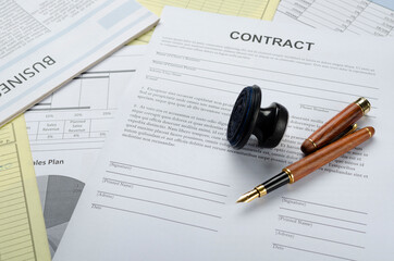 Paperwork and signing contract.Stamp, pen and lot of documents on the desk