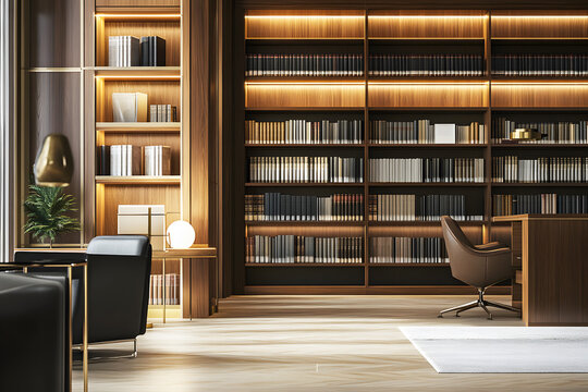 Law library with shelves of books and legal documents in a professional office. Law room office Library for study and learning. Interior photography detail of books on shelf in law firm.
