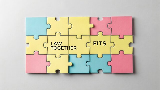 Puzzle pieces in pastel colors with the words "Law" and "Fits" demonstrating unity and collaboration in legal matters