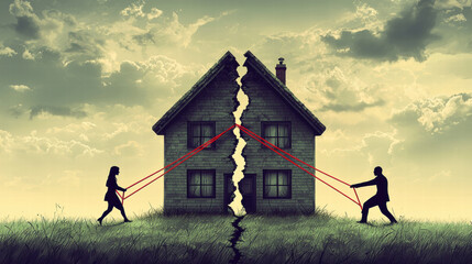 Divorce lawyer mediation meeting with attorney, couple discussing children, property, and family matters, symbolized by split house