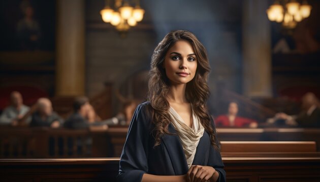 Elegant leather briefcase on a polished wooden bench in a professional courtroom setting, symbolizing legal, business, or corporate concepts, background with a place for text