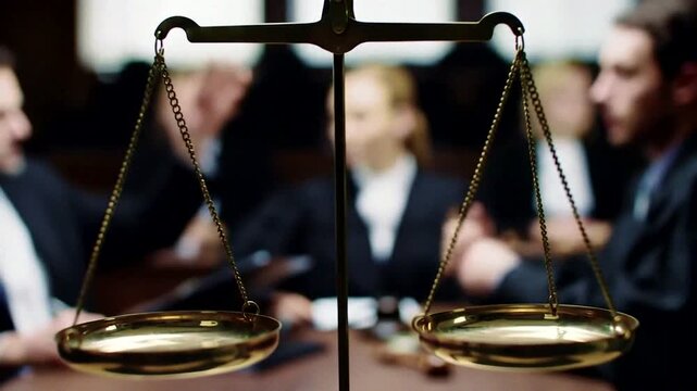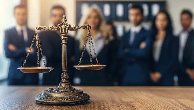 Brass Scales of Justice with Blurred Legal Team Background