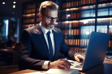 A gavel beside a laptop displaying digital legal data in a modern office.
