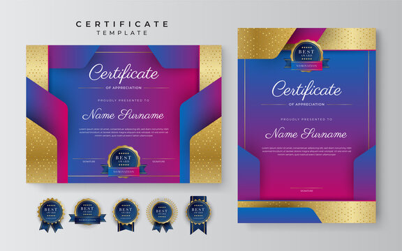 Modern blue pink technology certificate of achievement border template with luxury badge and modern line pattern. For award, business, and education needs