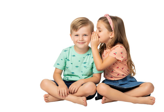 Playful kids sitting cross legged as a girl leans in to whisper a secret to her smiling friend, useful for parenting content about sibling bonding and communication skills in preschool projects