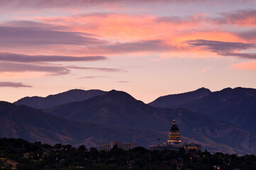 Dawn over the Utah State Capitol and Wasatch Mountains in Salte Lake City, Utah.