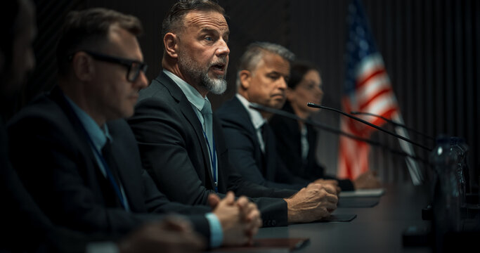 Caucasian Male Organization Representative Speaking at Economic Forum. Head Of USA Delegation Delivering Speech at International Political Summit Press Conference. Diverse Delegates Listening.