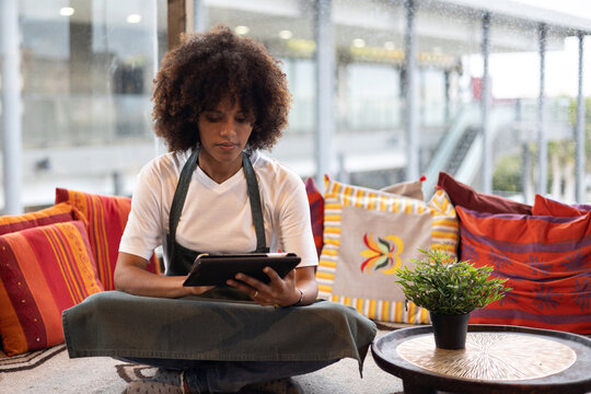 Portrait of young African waitress woman looking at a tablet in her leisure time.