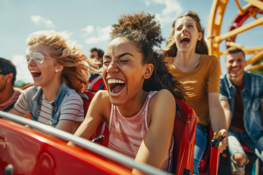friends having a fun day at a theme park, with rides, games, and happy faces, highlighting leisure and adventure.