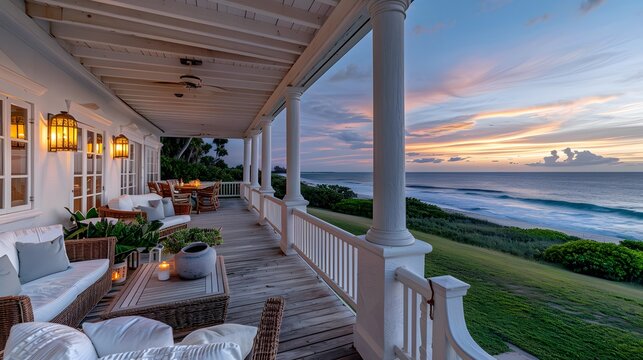 Luxurious beachfront porch with comfortable seating overlooking a serene ocean sunset, ideal for relaxation and leisure themes.