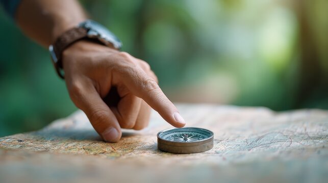Close up view of a traveler's hand pointing at a compass resting on a map, carefully planning a summer camping trip amidst the beauty of nature and the wilderness