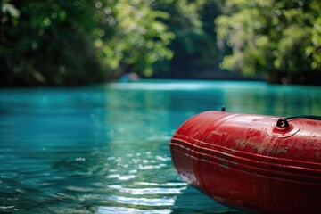 A bright red inflatable boat floats on the surface of a calm body of water, perfect for leisurely activities or as a decorative prop