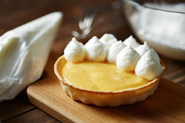 tartlet  with lemon curd. Hands in the frame.Top view