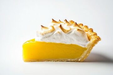 A vibrant slice of lemon meringue pie highlighting a rich yellow filling and a perfectly browned meringue topping, offering a zesty and sweet delight experience.