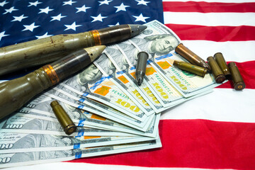 American flag with dollars money, bullets, shells, cartridges and projectiles on it. Lend-Lease concept.  Army concept. Sales of weapons and ammunition..Military industry, war, global arms trade.