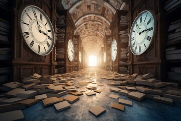 A lengthy corridor lined with books and a clock in the center. More books are scattered on the floor. Generative AI