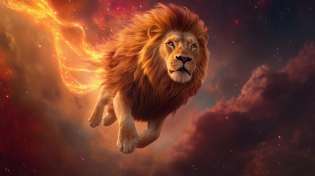 Lion leaping through a cosmic void, its mane trailing glowing celestial ribbons