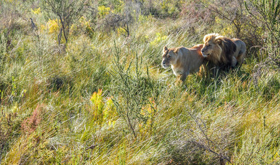 South Africa, Garden Route, Plettenberg Bay, Game Reserve, lion and lioness (Panthera leo) moving in the savanna