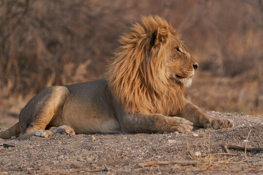 Male African Lion (Panthera Leo) resting before heading off to hunt as dusk approaches in Ongava Game Reserve, Namibia