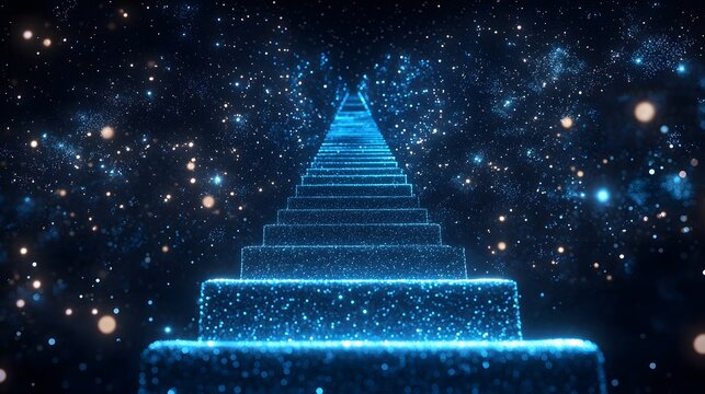 staircase made entirely of shimmering light particles ascends into a night sky full of stars