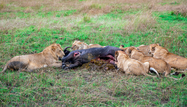 Pride of African Lions (Panthera Leo) killed a young buffalo on hunting in Masai Mara national reserve, Kenya. Africa