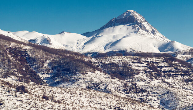 Panoramic view of Espigüete peak in the Eastern Mountain of Leon. Sunny day with snow
