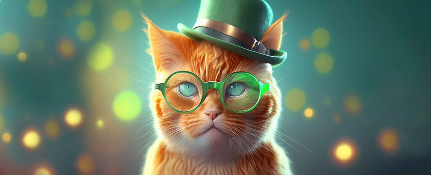 Portrait of a cat. Red cat in a leprechaun hat and glasses on a green background. Banner. Wallpaper. Copy space. Bokeh. Generated AI. Edited in Photoshop